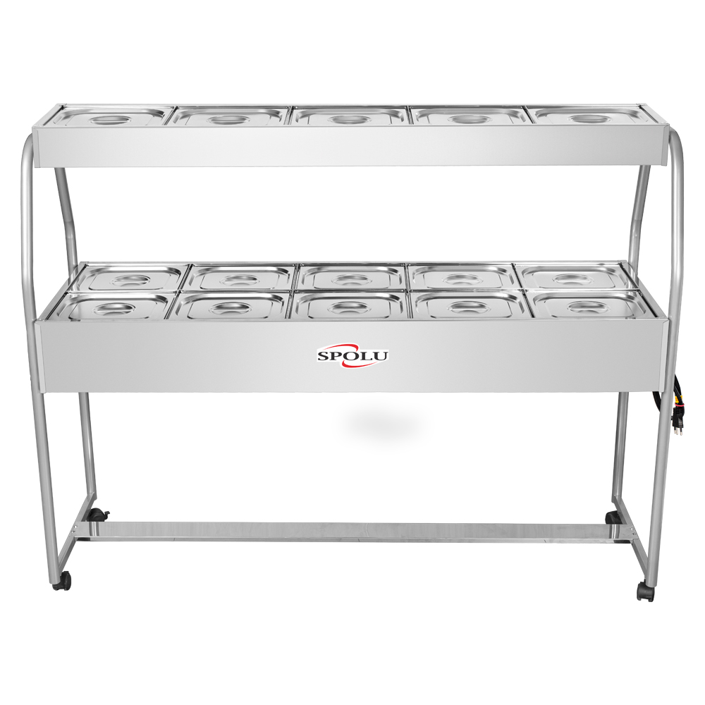A função do Buffet térmico SPOLU é manter os alimentos servidos em suas cubas quentes enquanto em exposição. Possui cubas fabricadas em aço inox 201, tanque, tampas e moldura externa em aço inox 430 e estrutura de sustentação tubular. Sua resistência blindada é confeccionada em aço inox e controlada por um termostato com escala de 30ºC a 120ºC.