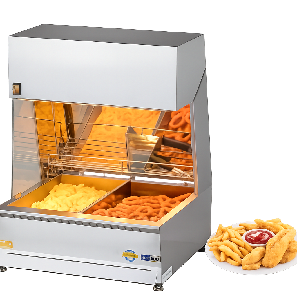 Ele possui um sistema de aquecimento através de 3 lâmpadas, garantindo que as frituras sejam mantidas na temperatura ideal.